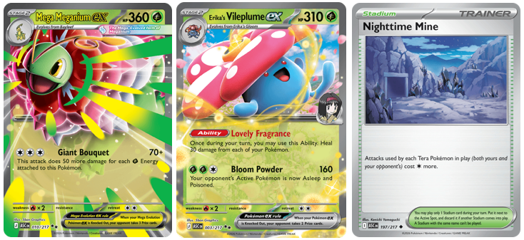 Let’s begin with some of the best cards that barely missed a spot on our Top 5. Mega Meganium ex is a great new attacker that can fit right into the Venusaur ex or the Teal Mask Ogerpon/Meganium decks. With aid of Forest of Vitality, your small Chikorita can quickly turn into a 360 HP behemoth that can easily OHKO any opposing Mega Evolution Pokémon, as long as baby Meganium is in play. Next card up, Erika’s Vileplume ex, poses as a very viable counter to spread decks like Grimmsnarl/Munkidori and Frosslass/Munkidori. All thanks to Vileplume’s ability healing 30 HP from each of your Pokémon, rendering Munkidori useless. If the spread archetypes become stronger, this card will definitely help as a counter that will hopefully keep these decks in check. Last, but not least, we got Nighttime Mine. A stadium card that makes the attacks of Tera Pokémon cost one colorless more. This is great to keep Dragapult, Charizard and Wellspring Mask Ogerpon in check. We didn’t mention Tera Box as a whole, as we believe